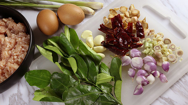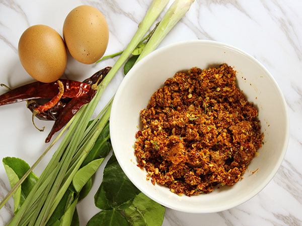 นำเครื่องพริกแกงโขลกรวมกันให้ละเอียด ซึ่งได้แก่ พริกแห้ง ข่า ตะไคร้ ใบมะกรูด กระเทียม หอมแดง