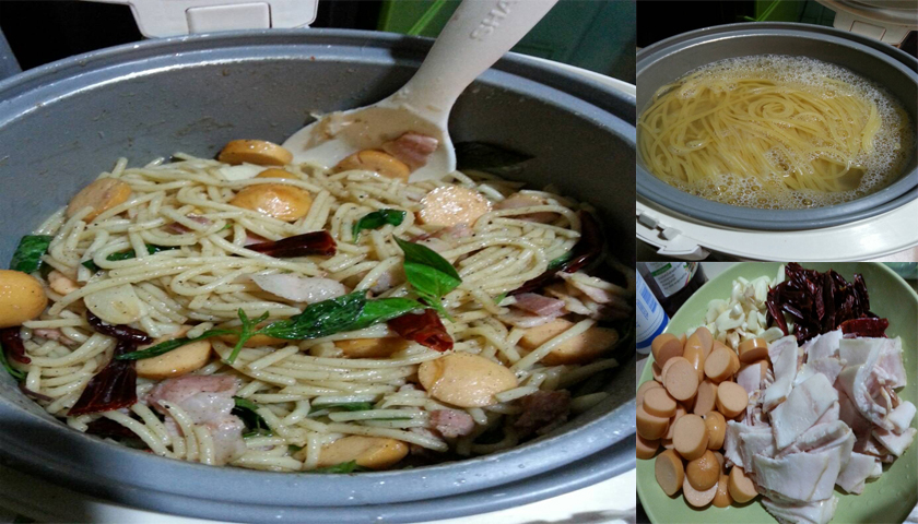สปาเกตตีผัดเบคอนและไส้กรอ